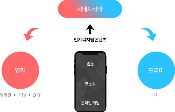 시네드라마란 디지털콘텐츠플랫폼(웹툰, 웹소설등)에 연재 및 서비스 되고 있는 인기 콘텐츠를 영화와 드라마의 2종의
